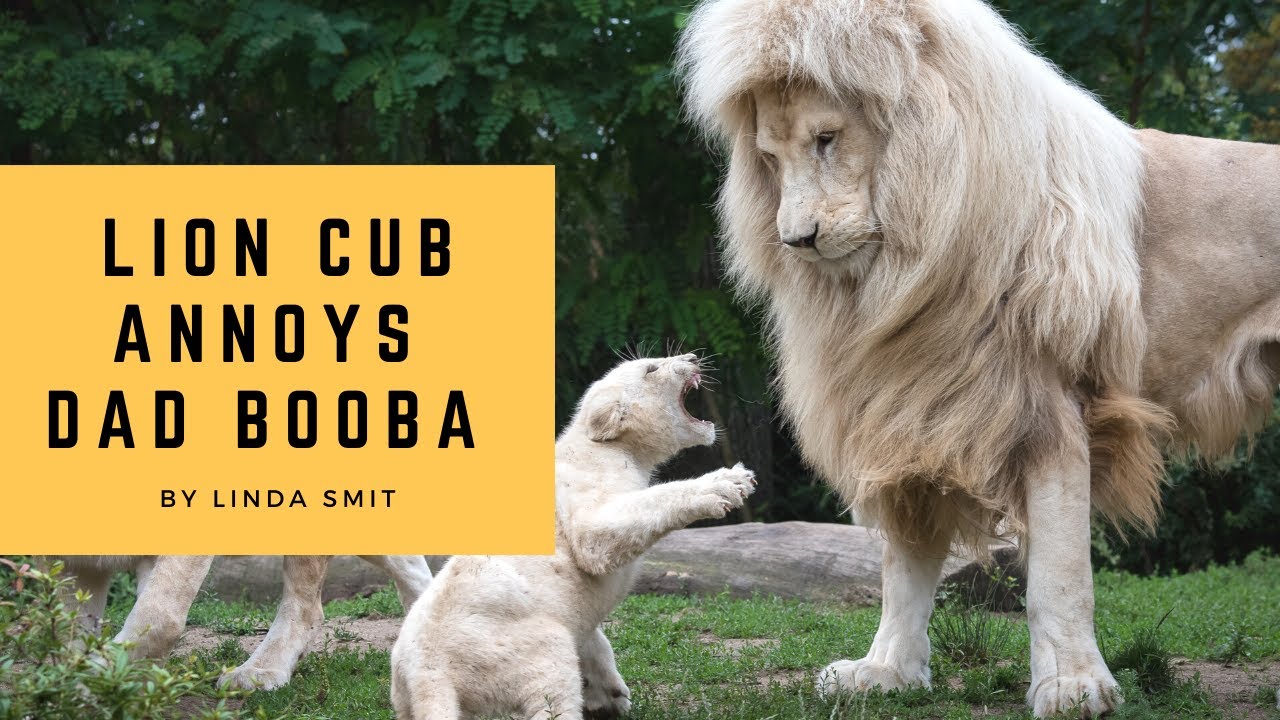 Lion cub annoys his dad. Cubs are taught a lesson